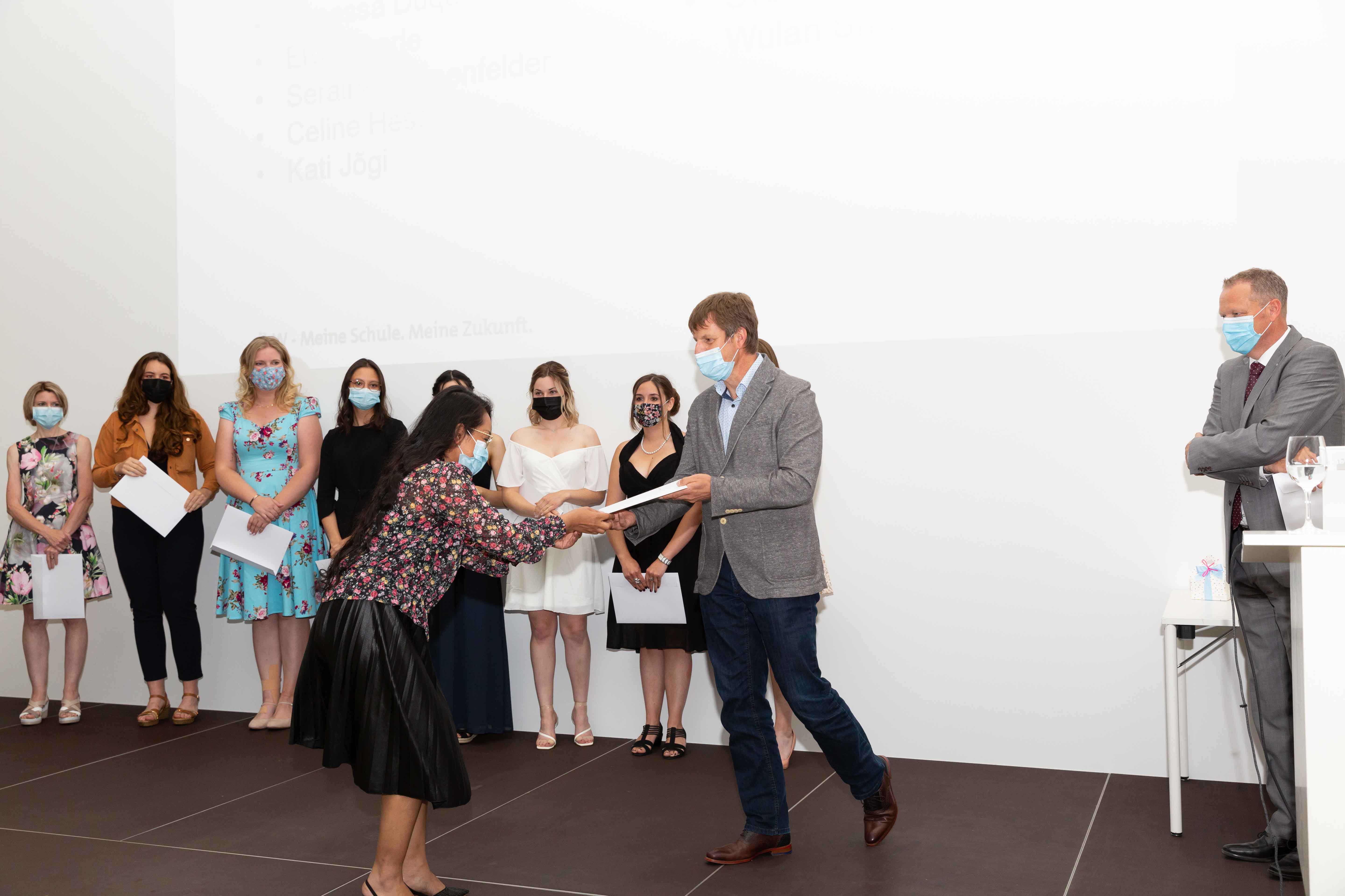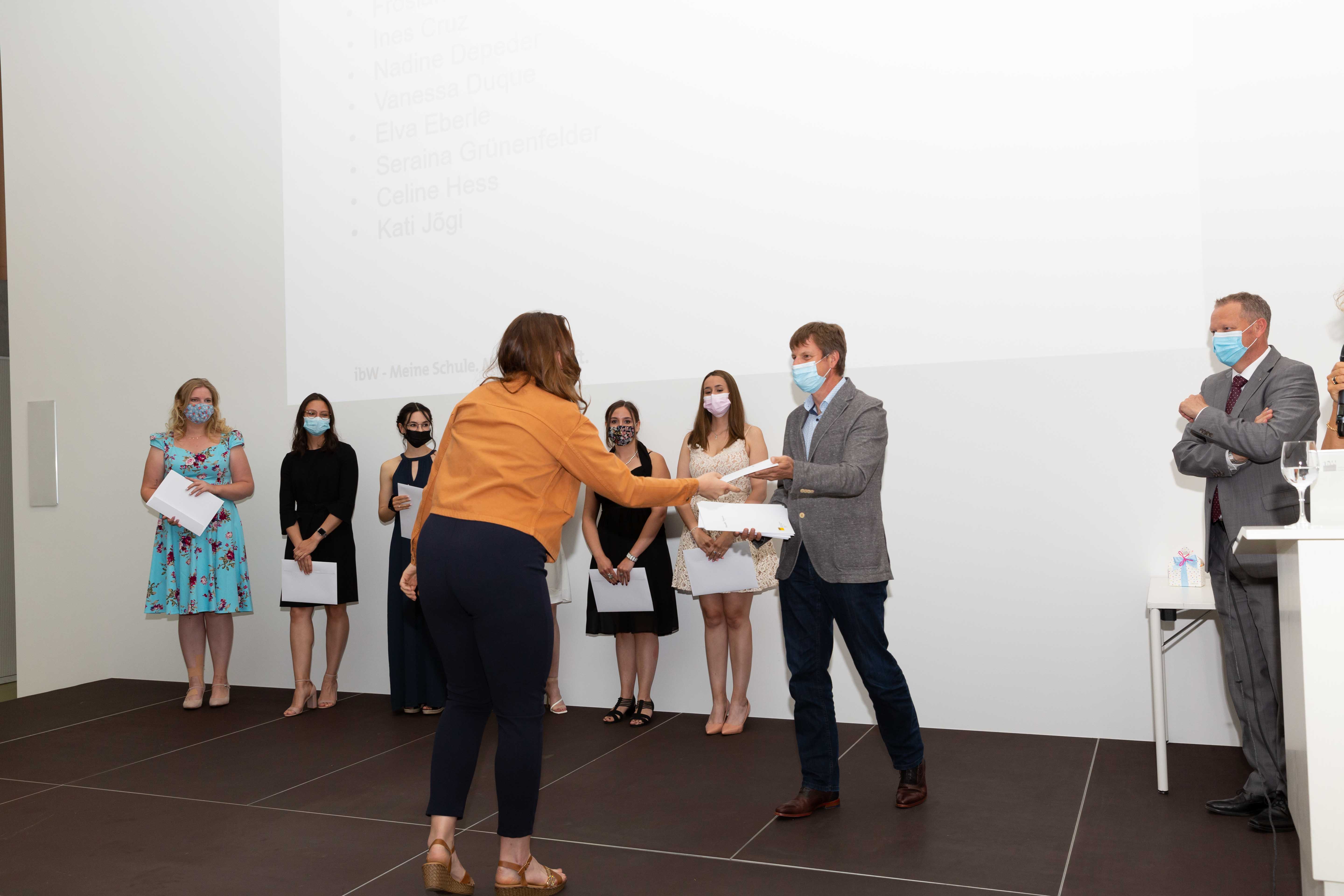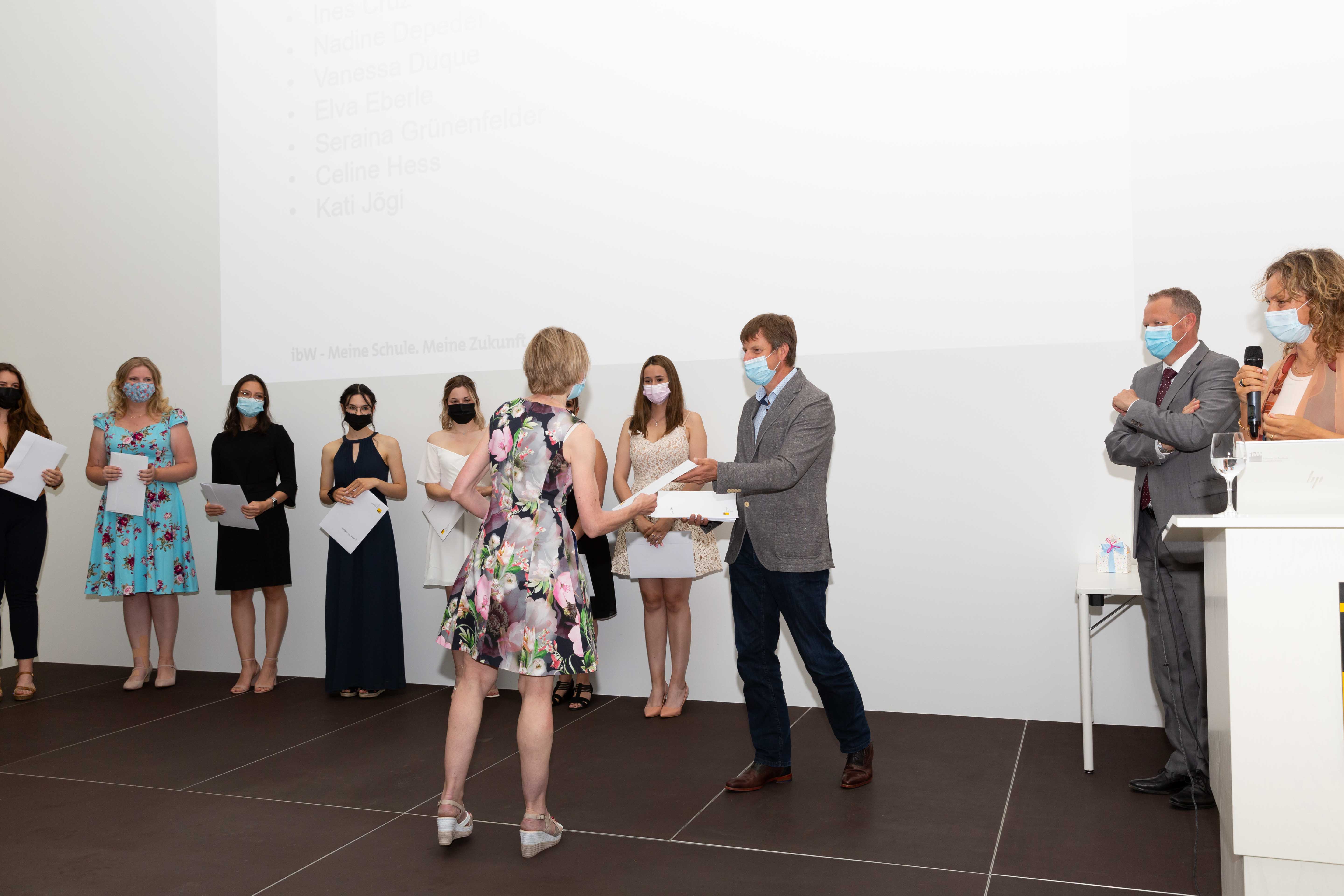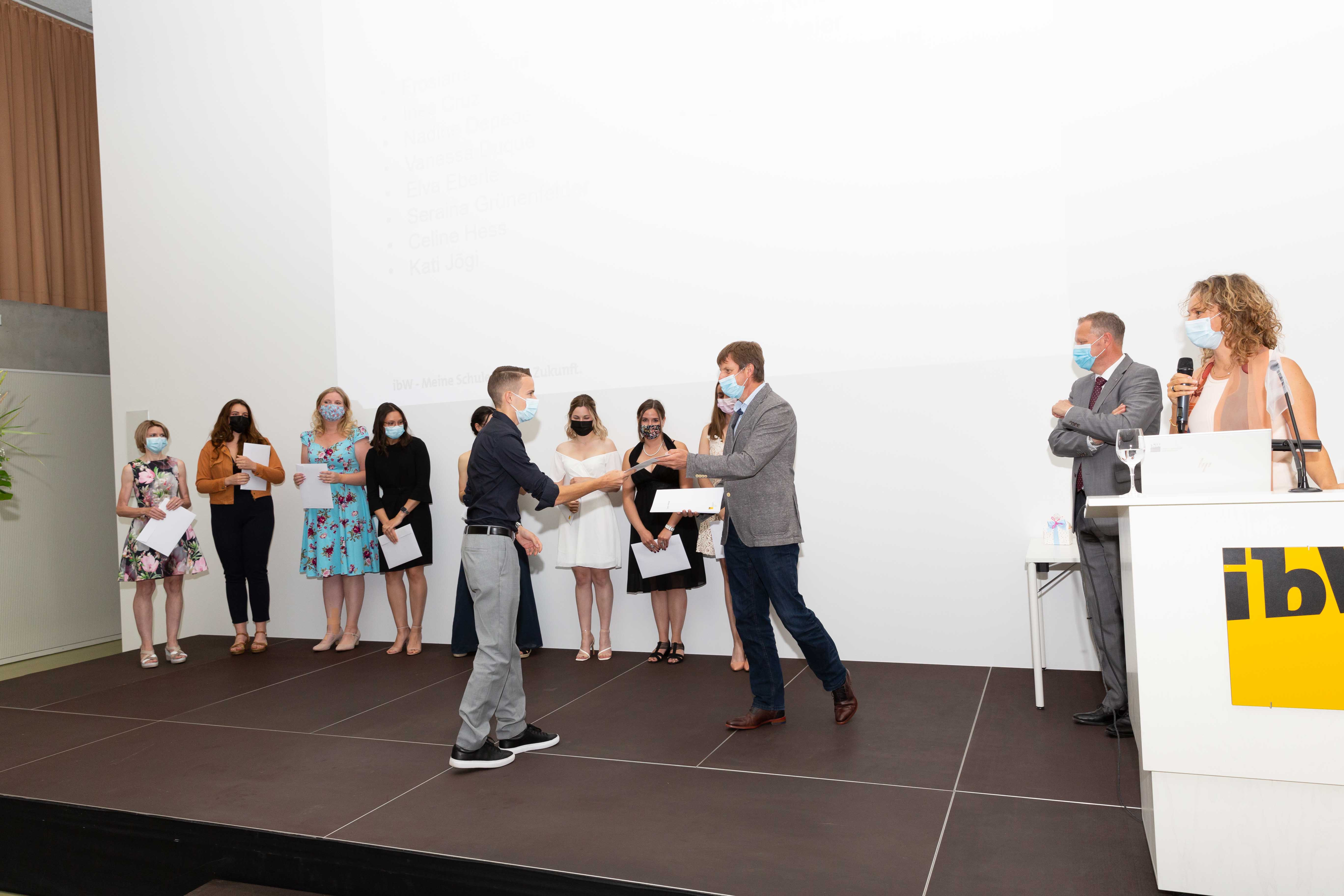 Am 2. Juli fand in der Aula der ibW in Chur die (corona-bedingt) im kleinen Rahmen gehaltene Diplomfeier der Klasse Handelsdiplom VSH statt. Nach der Begrüssung durch die Fachvorsteherin Iris Lüchinger Lohri und einem Rückblick auf den Lehrgang, welcher vorwiegend im Fernunterricht stattgefunden hat, durften die 15 erfolgreichen Absolventinnen und Absolventen das lang ersehnte VSH-Diplom entgegennehmen. Die Diplomübergabe wurde durch den Schulleiter Wirtschaft, Michael Meier, und dem Direktor, Stefan Eisenring, vorgenommen. Anschliessend wurde bei einem gemeinsamen Apéro auf den erfolgreichen Abschluss angestossen.