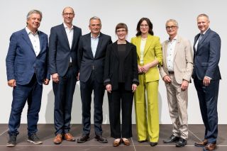 ibW-Präsident Jürg Michel, ibW-Fördervereinspräsident Martin Candinas (l.) und Direktor Stefan Eisenring (r.) mit den Gästen Joos Sutter, Verwaltungsratspräsident der Coop-Gruppe, Regierungsrätin Dr. Carmelia Maissen, Journalistin Oceana Galmarini und Standespräsident Franz Sepp Caluori (v.l.n.r.).