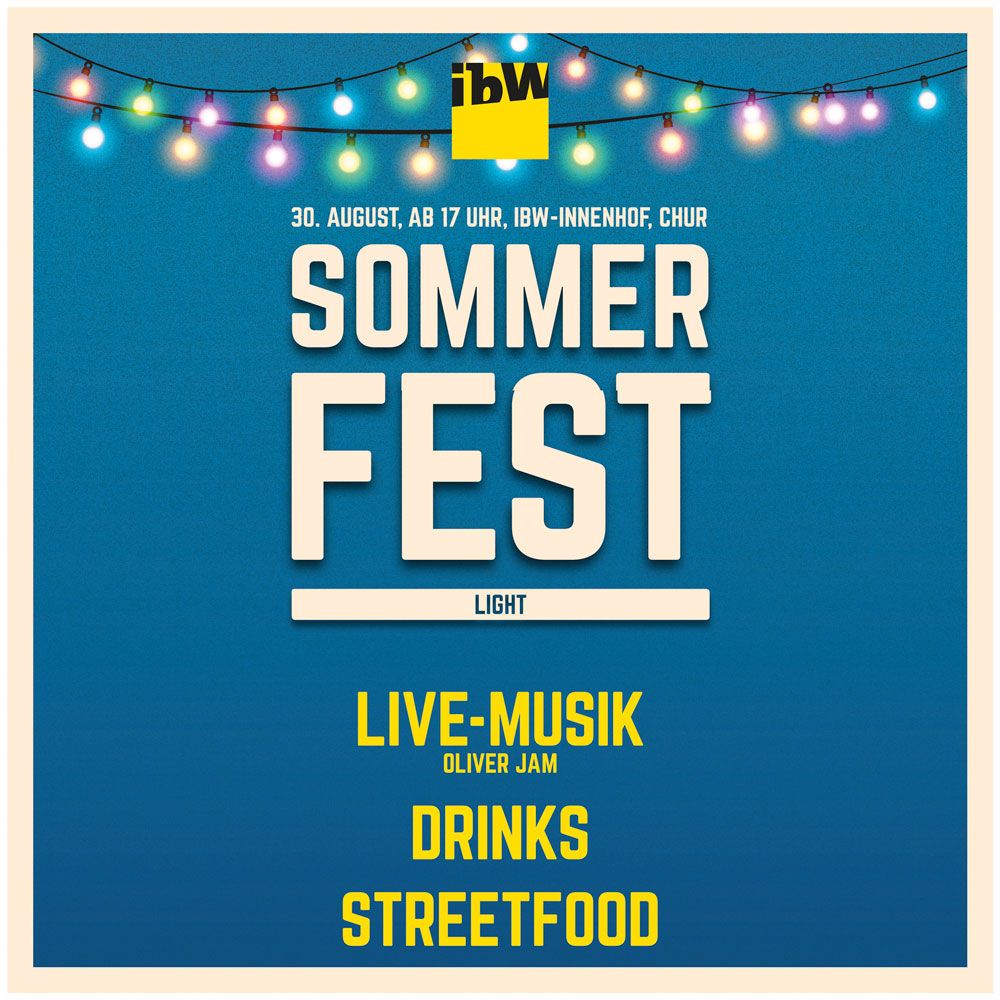 Save the date: Am Freitag, 30. August feiern wie im Innenhof der ibW an der Gürtelstrasse 48 in Chur mit Live-Musik von Oliver Jam, köstlichem Essen und feinen Drinks vom Kleinwaldegg. Der Eintritt ist kostenlos - wir freuen uns auf Euch!