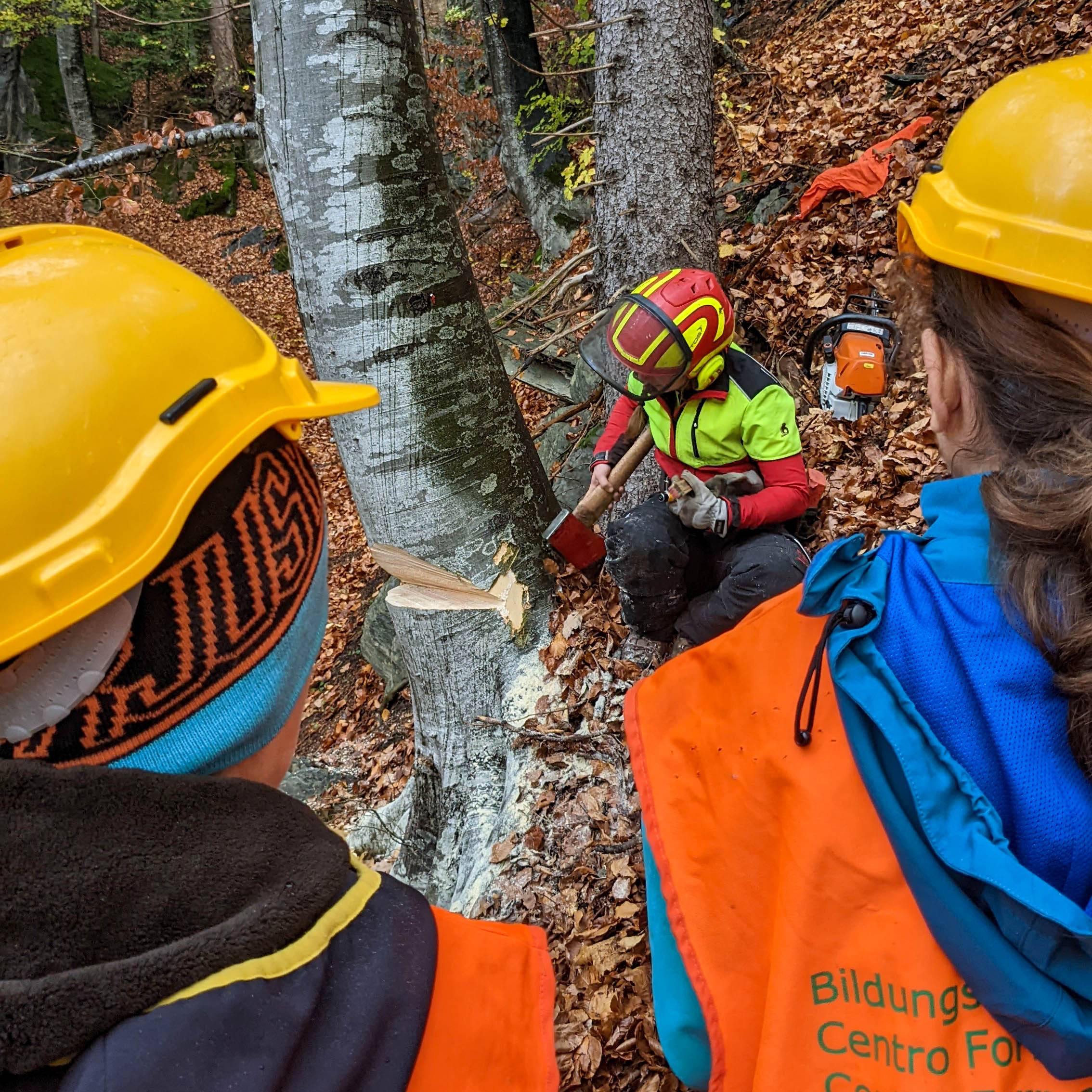 Gespannt treffen wir uns früh morgens beim ibW Bildungszentrum Wald Maienfeld. Alle sind ausgerüstet mit wetterfester Kleidung und Schutzausrüstung. Von Maienfeld geht’s mit den ibW-Bussen nach Bad Ragaz. Oberhalb von Bad Ragaz haben wir in einem Teil des Waldes unser «Lager» aufgeschlagen.