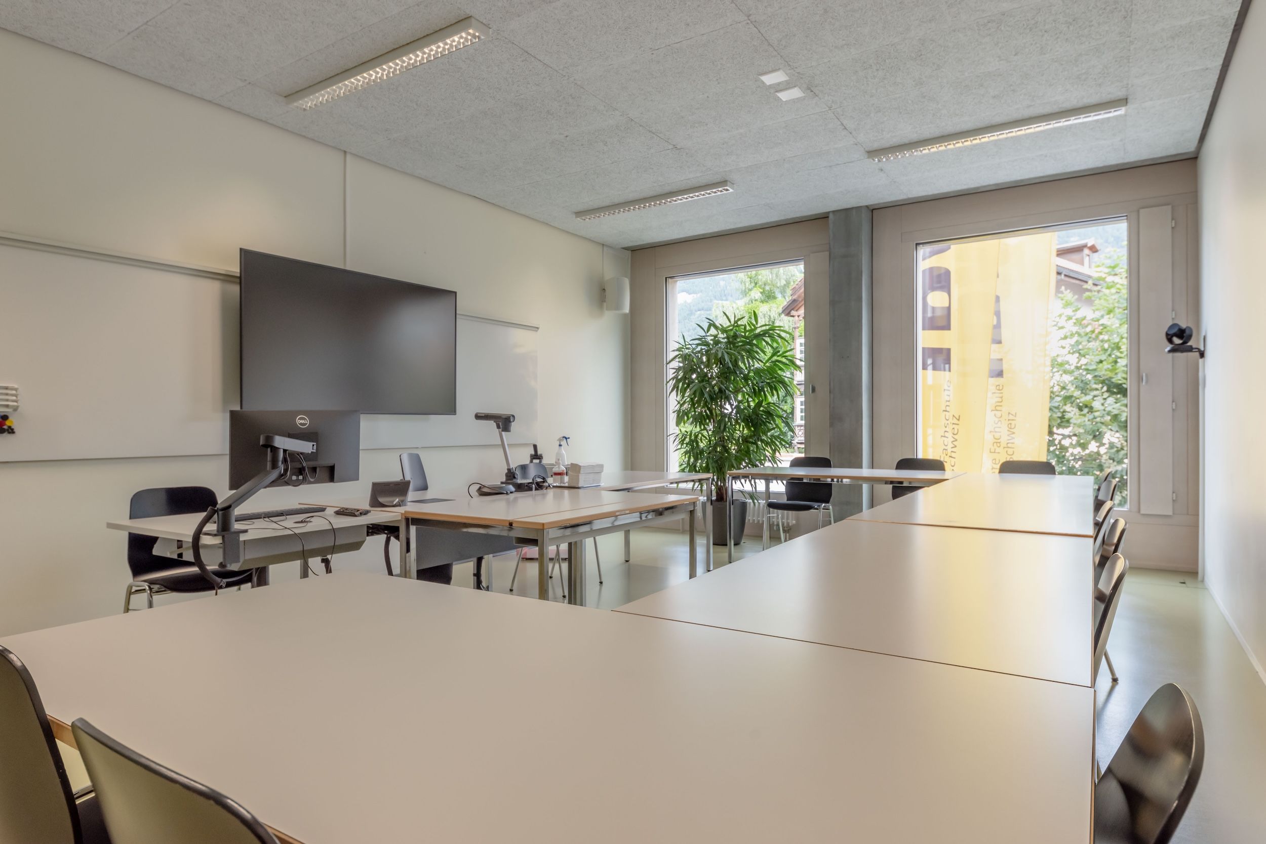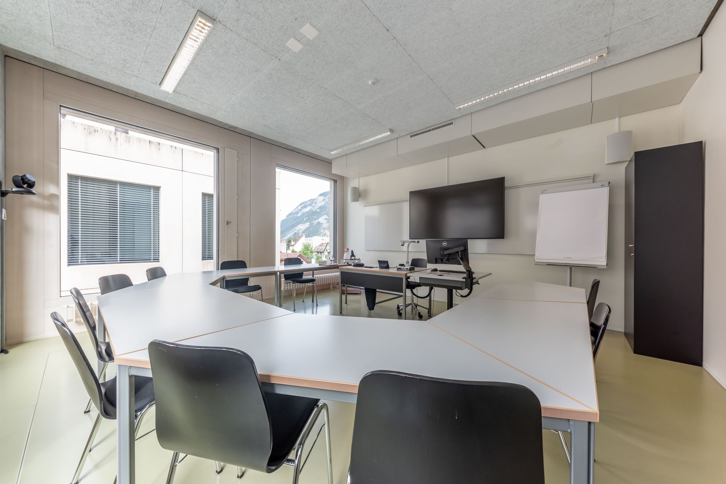 | Grundausstattung | Visualizer, Flipchart, Pinnwand, Moderationskoffer, grosser Monitor, Whiteboard, WLAN, Lautsprecher, Kamera und Mikrofon für Videoübertragung (via PC vor Ort) |